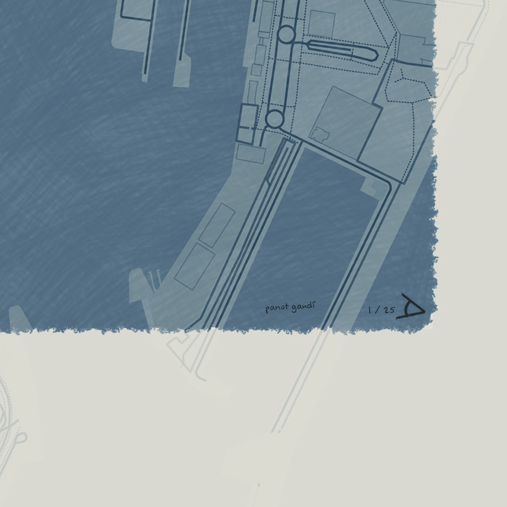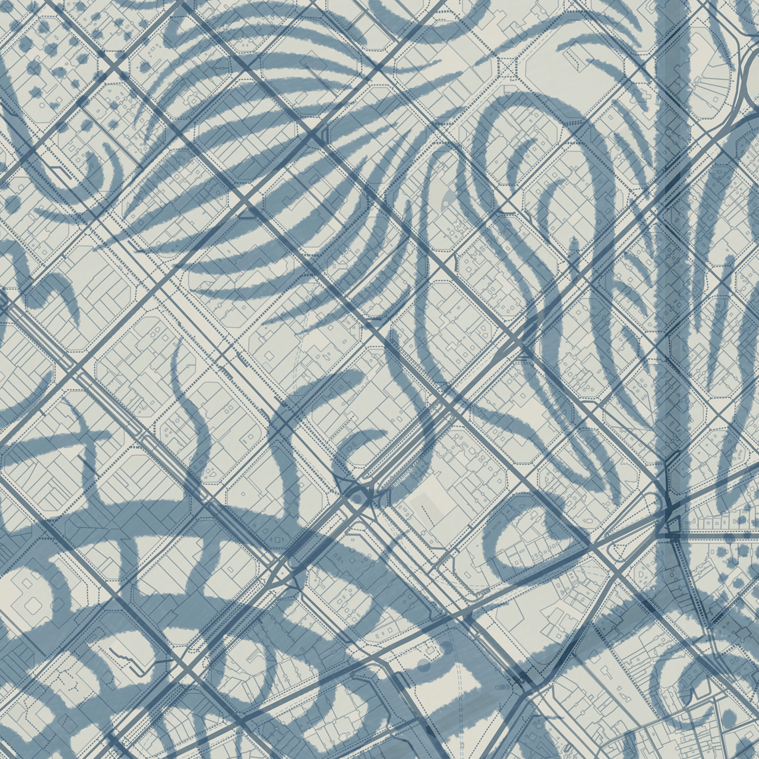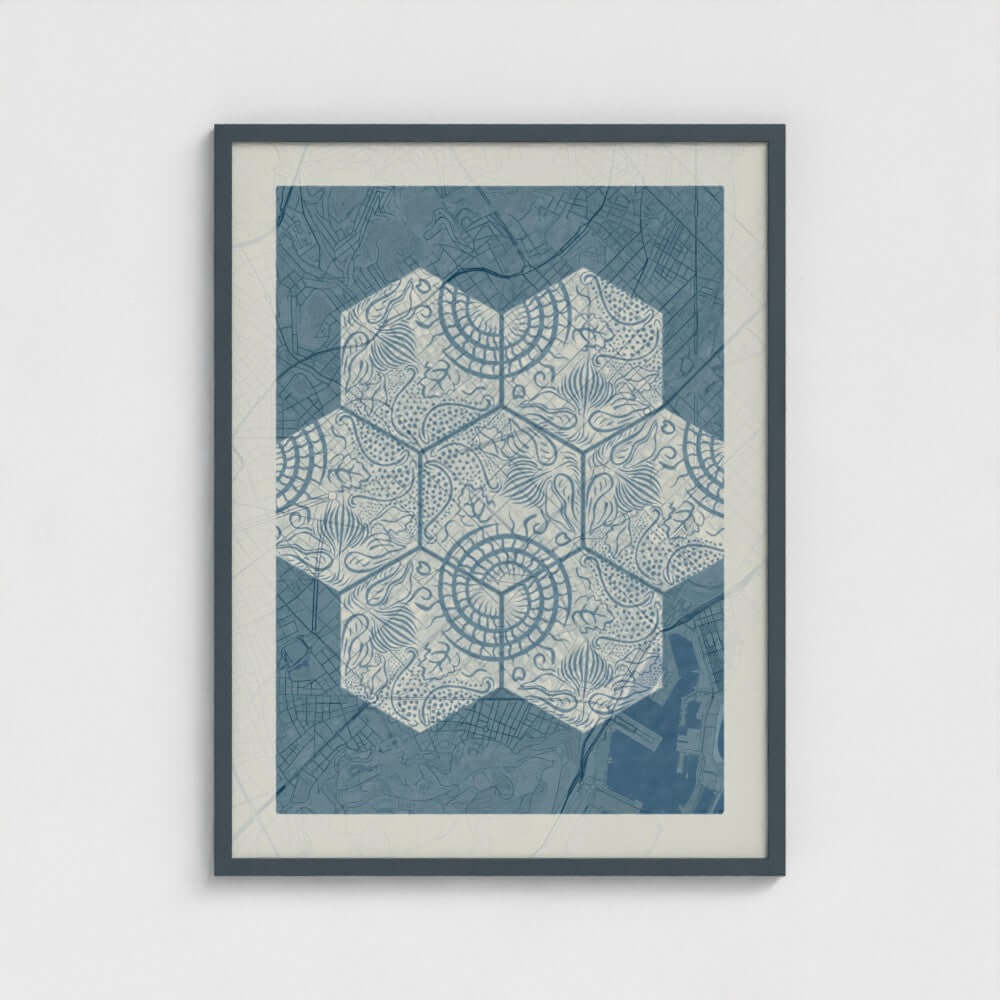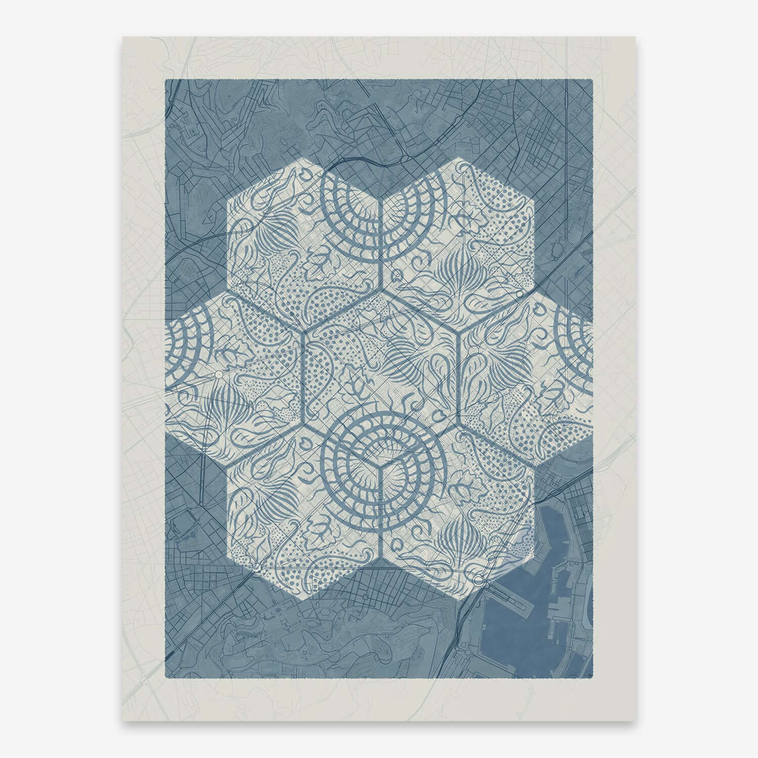 Diseñado por Antoni Gaudí en 1904 junto a la casa Escofet, el panot Gaudí fue concebido originalmente para pavimentar la Casa Batlló, aunque finalmente se utilizó en las habitaciones de servicio de la Casa Milà, conocida como La Pedrera. Hoy en día, pavimenta todo el Paseo de Gracia como homenaje permanente al arquitecto. Esta obra lo reinterpreta superpuesto al mapa del Ensanche y el barrio de Gracia. Cada loseta muestra un tercio de sus tres motivos marinos —estrella de mar, amonites y algas—, revelando el diseño completo solo al unirse siete piezas.