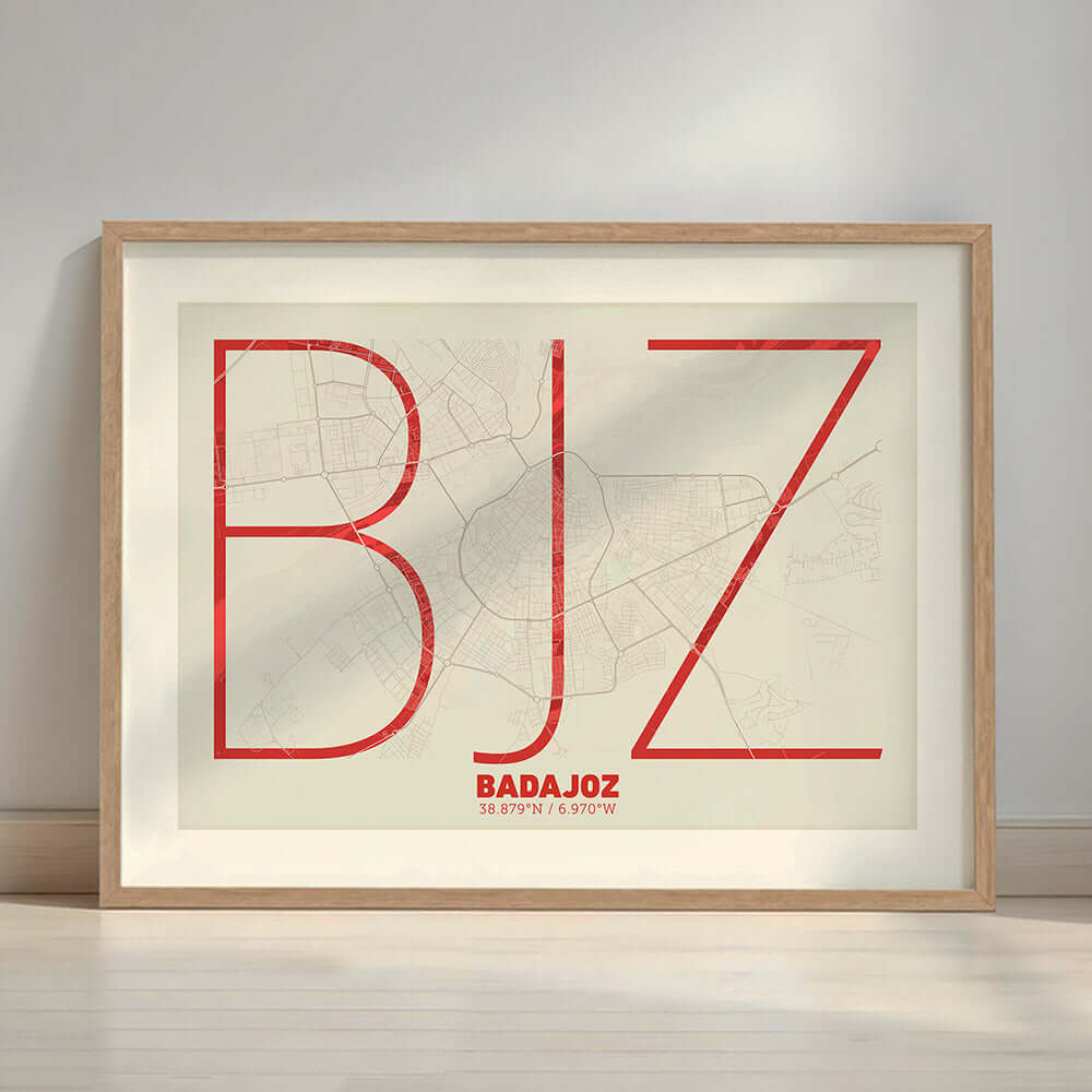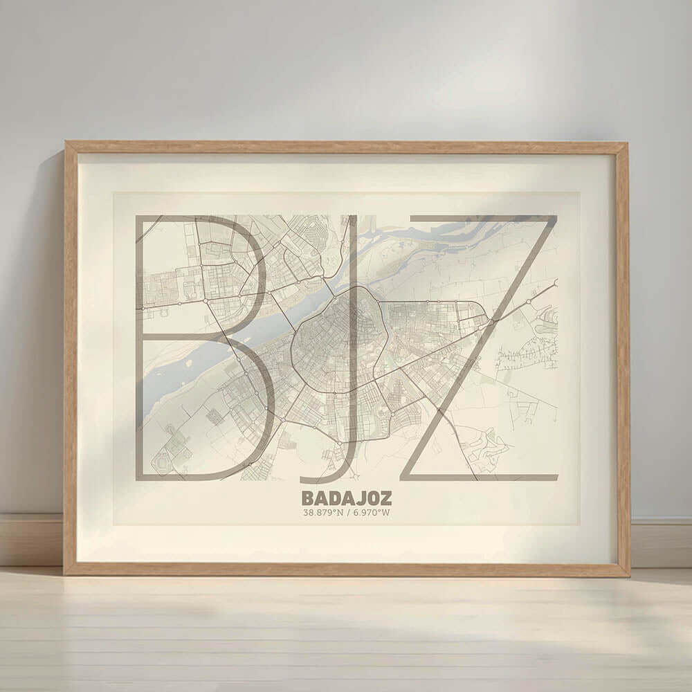 Transform your walls with our decorative prints that combine art and modern design, version 07. Each print features a detailed map of Badajoz as a base, with some of its letters in an ultra-fine typography that brings elegance and simplicity. Perfect for creating minimalist and sophisticated environments, this design fits into any space, from living rooms and bedrooms to modern offices.