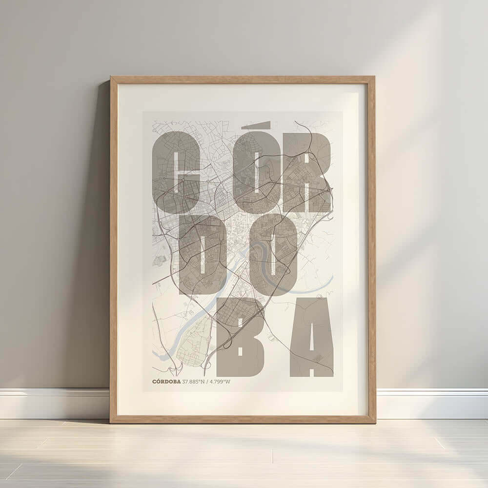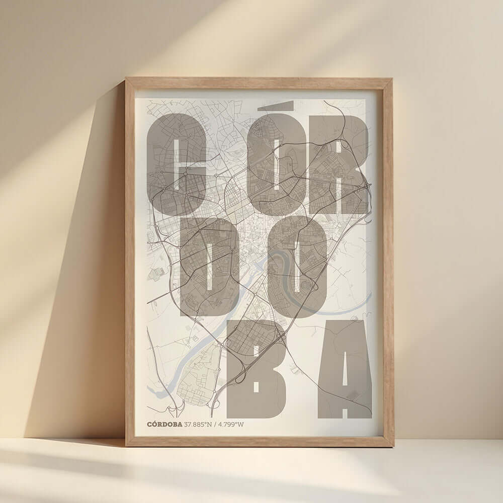 This poster, our design version 08, redefines cartographic art with a modern and bold approach. On a detailed map of Cordoba, its letters overlap in random positions, creating a visual game that mixes geography and typographic design. The composition, minimalist but full of personality, challenges traditional rules to offer a unique and contemporary design.