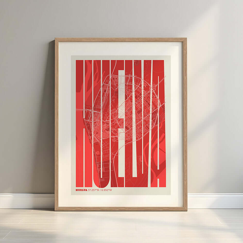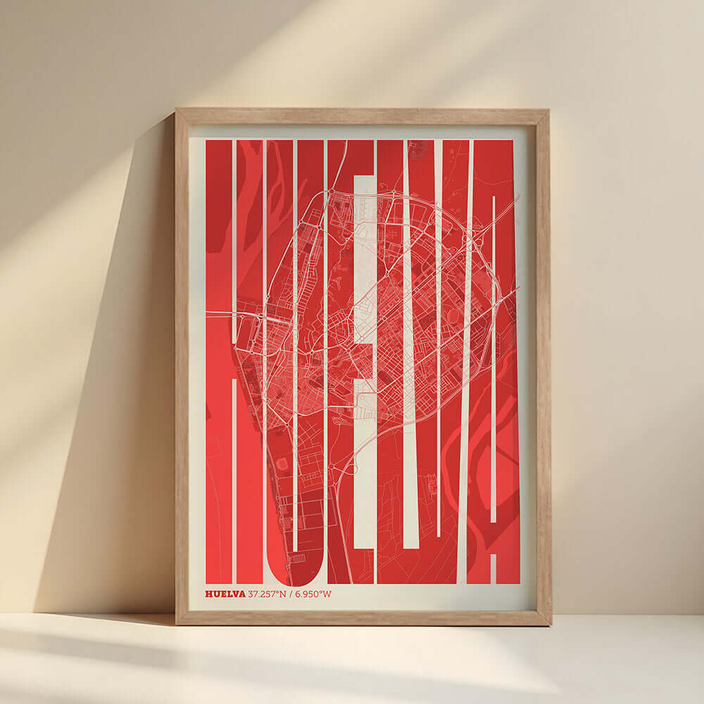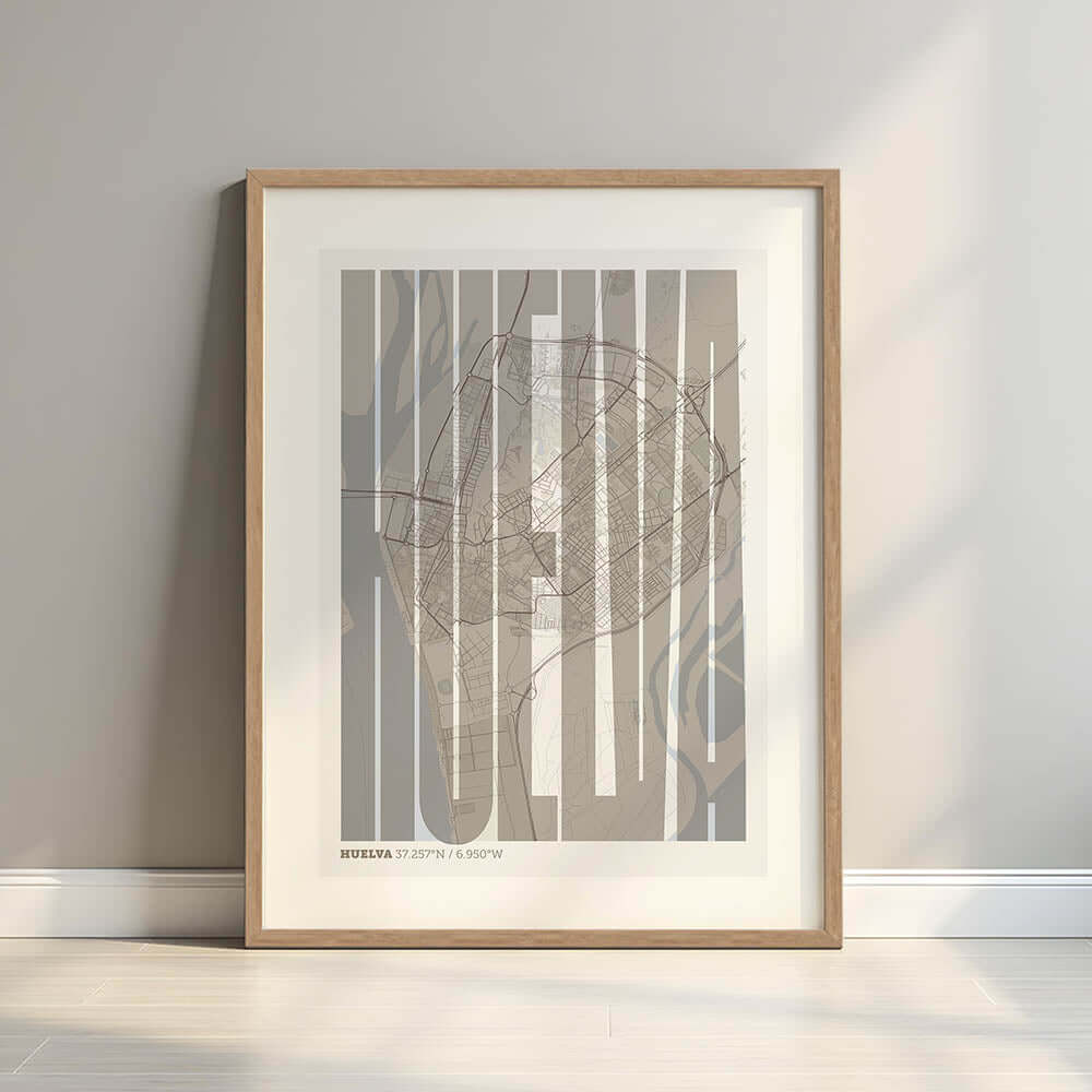 Huelva map poster designed for those who have lived in the city or have visited it at some point. It combines its map with details of typography, graphic design and architecture. The letters of its name are extra compressed to fit on the city map.
