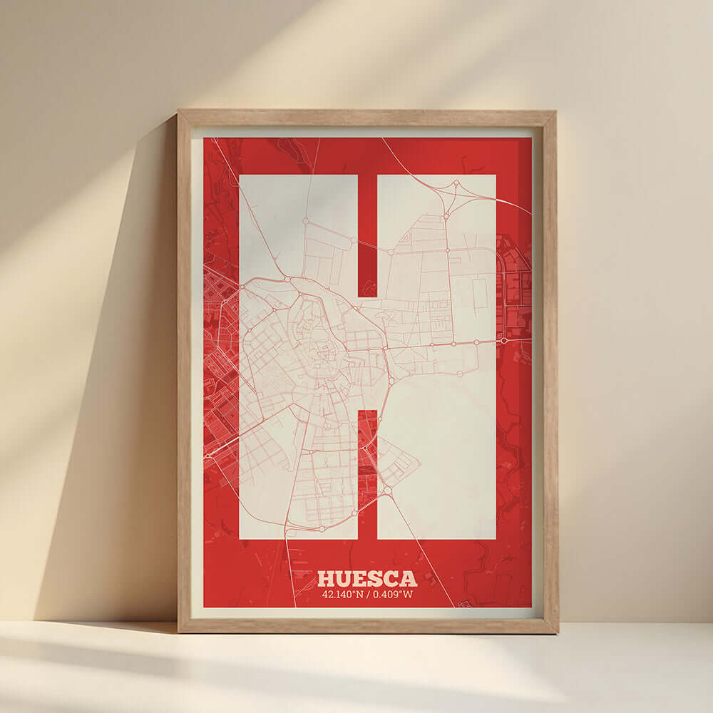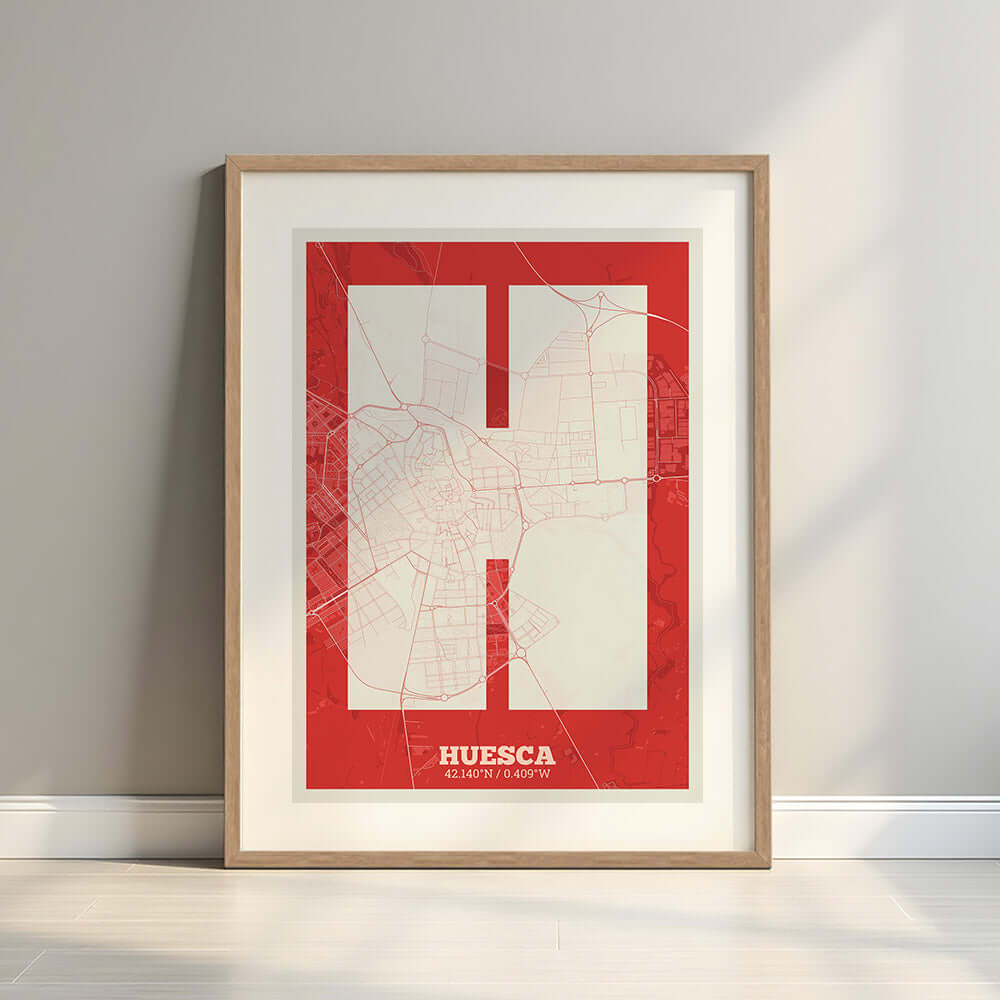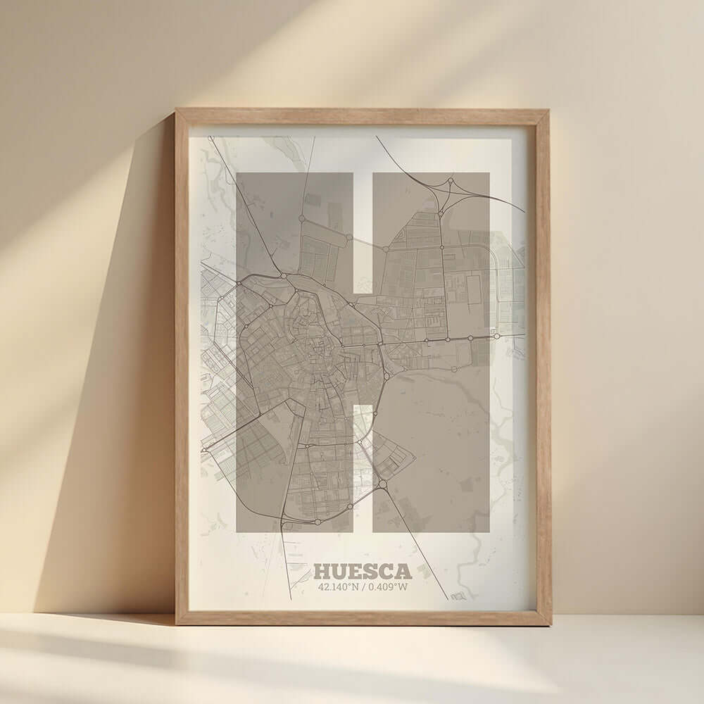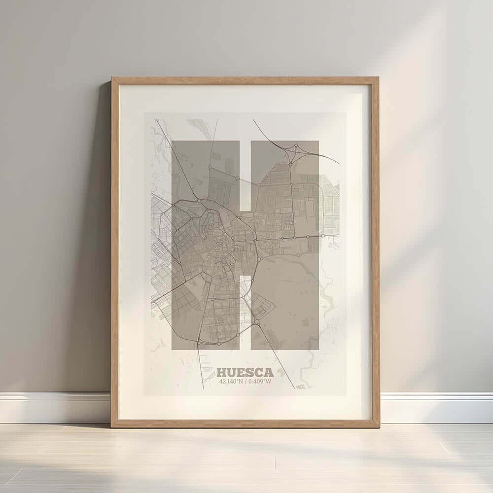 If you love maps and cartography, these prints with our design v02 are a must-have for your collection. Each frame features a detailed street map of Huesca If you love maps and cartography, these prints with our design v02 are a must-have for your collection. Each frame features a detailed street map of Huesca in its purest form, with a minimalist, distraction-free design. As a distinctive touch, an initial superimposed on the map stands out, creating a perfect balance between art and geography.