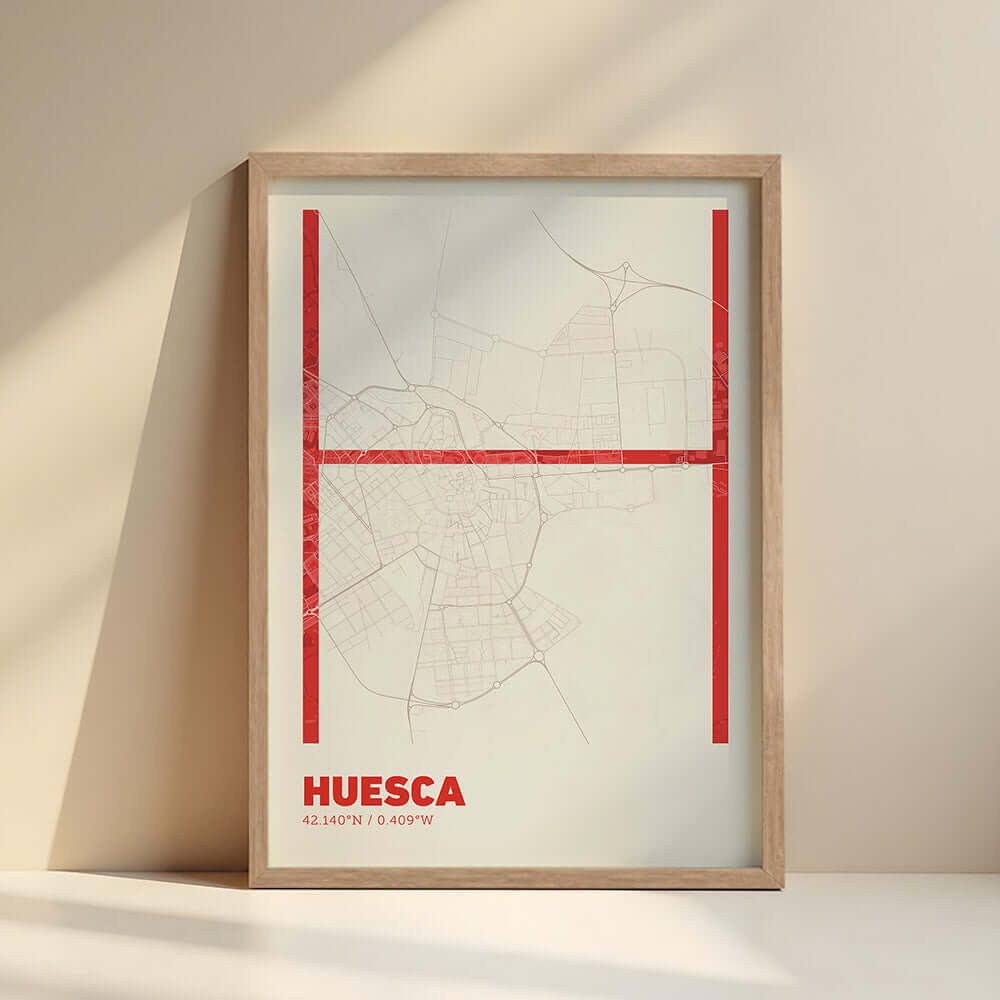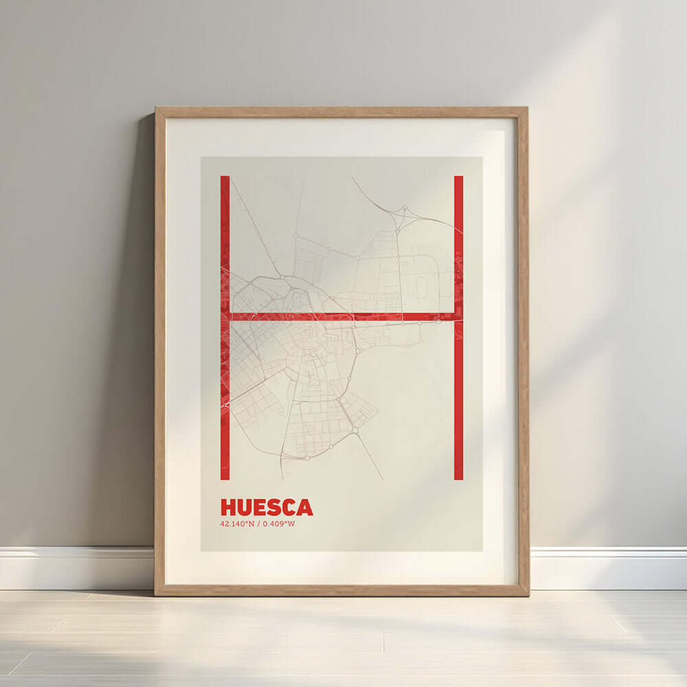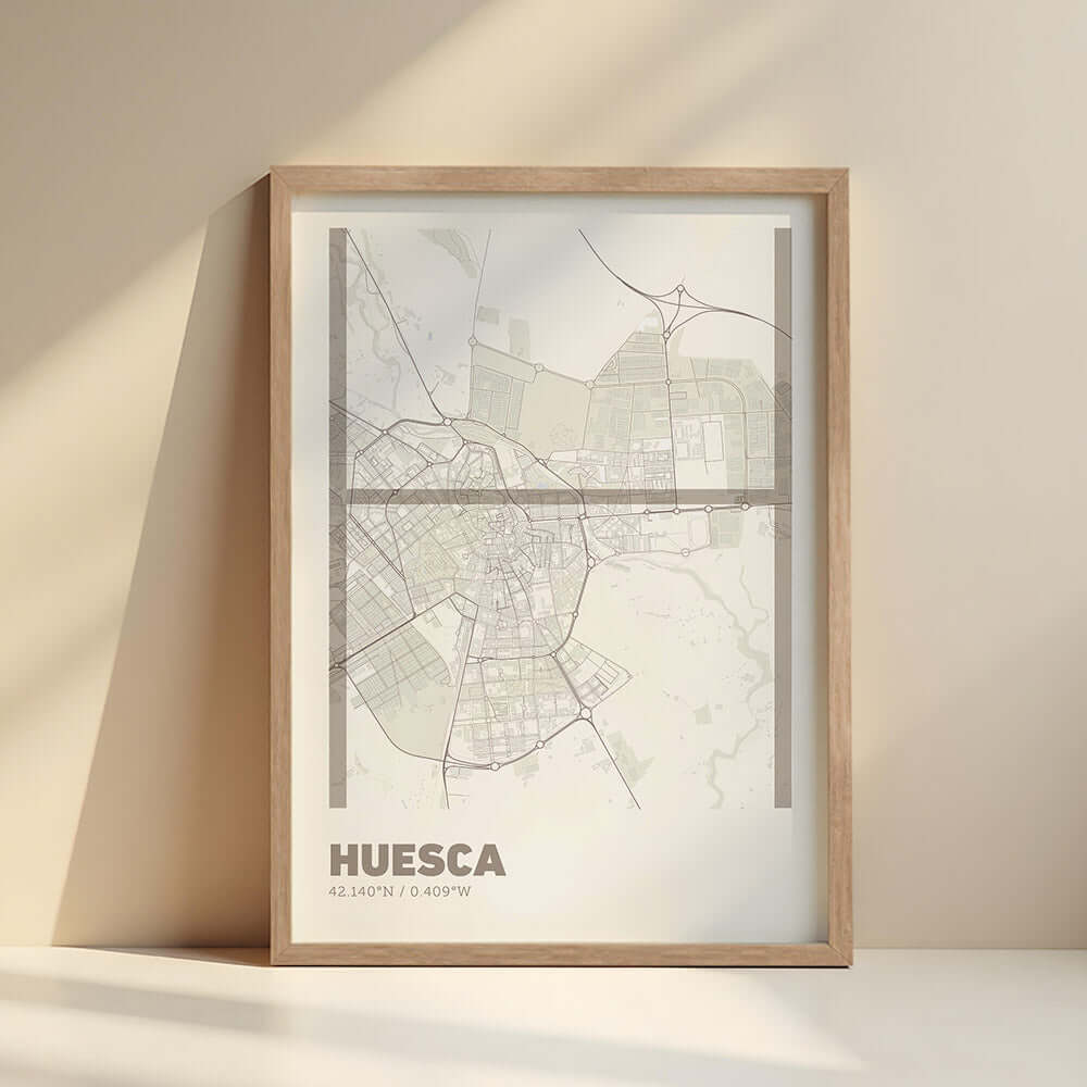 Transform your walls with our decorative prints that combine art and modern design, version 07. Each print features a detailed map of Huesca as a base, with some of its letters in an ultra-fine typography that brings elegance and simplicity. Perfect for creating minimalist and sophisticated environments, this design fits into any space, from living rooms and bedrooms to modern offices.