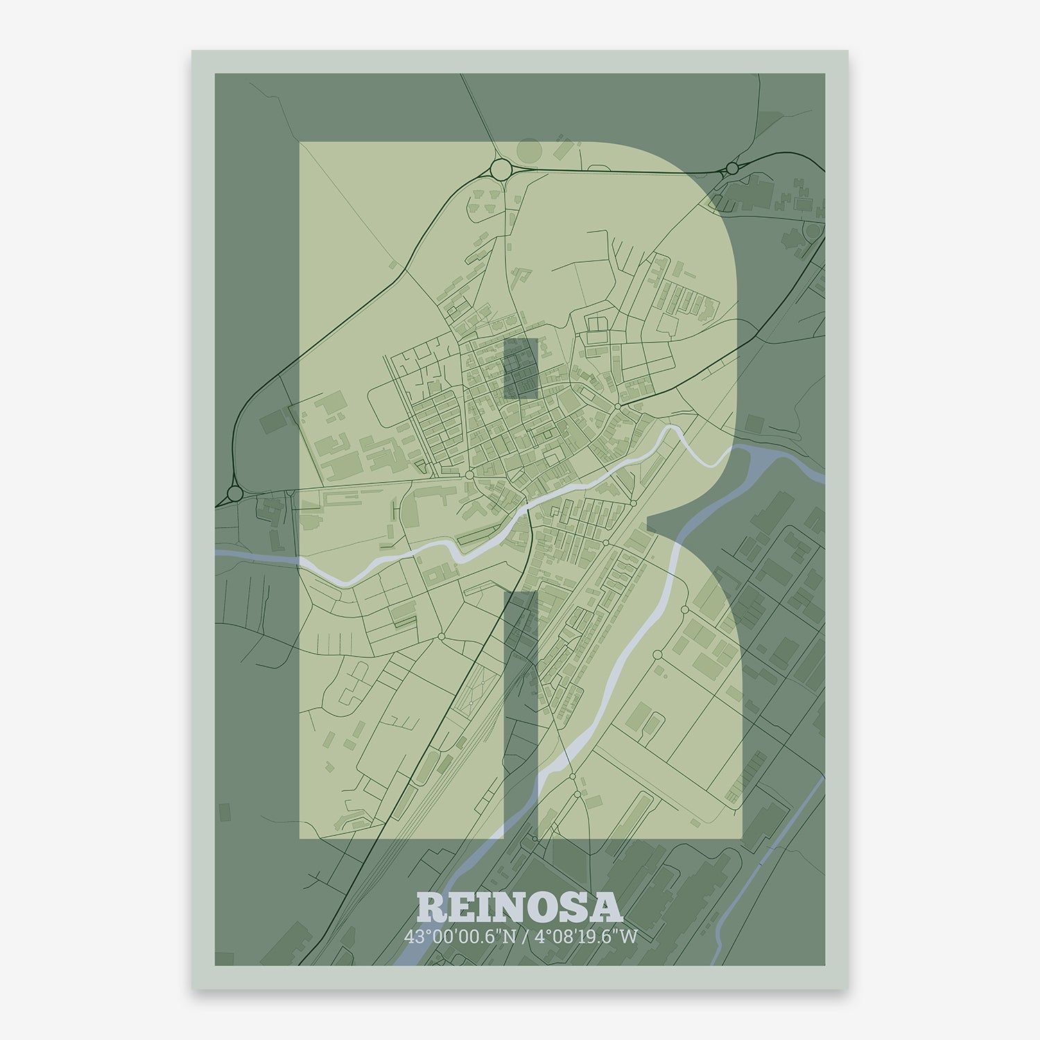 If you love maps and cartography, these prints with our design v02 are a must-have for your collection. Each frame features a detailed street map of Reinosa, Cantabria If you love maps and cartography, these prints with our design v02 are a must-have for your collection. Each frame features a detailed street map of Reinosa, Cantabria in its purest form, with a minimalist, distraction-free design. As a distinctive touch, an initial superimposed on the map stands out, creating a perfect balance between art and geography.