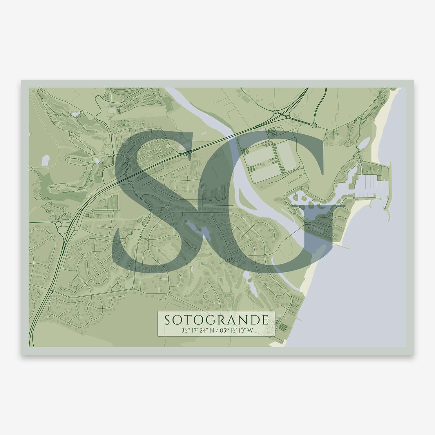 Surprise with a unique and meaningful gift: a modern print with the map of Sotogrande and its initials superimposed. This minimalist and elegant design, our version 06, is perfect for commemorating special moments, decorating with style or simply showing your love for the city. In addition, you can personalize the text of the poster to make it even more special, or choose from our exclusive designs. Ideal for Sotogrande lovers, travelers or fans of contemporary design, this print is a gift that will not go unnoticed. Give an original touch to your celebrations and create unforgettable memories with this unique detail.